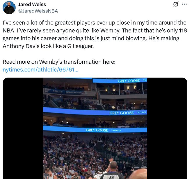 美記Jared Weiss也發(fā)文感嘆文班亞馬首秀恐怖的表現(xiàn),直言自己看過很多NBA球員打球,但從沒有見過文班如此罕見的存在,他才打了118場比賽,就讓對位的濃眉哥看起來像是G聯(lián)賽球員一樣。