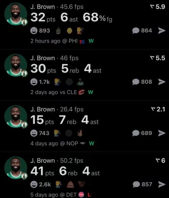 最近4場比賽,布朗4戰(zhàn)有3場30+,還有1場40+,且命中率都在50%上下徘徊,算是徹底燃盡。